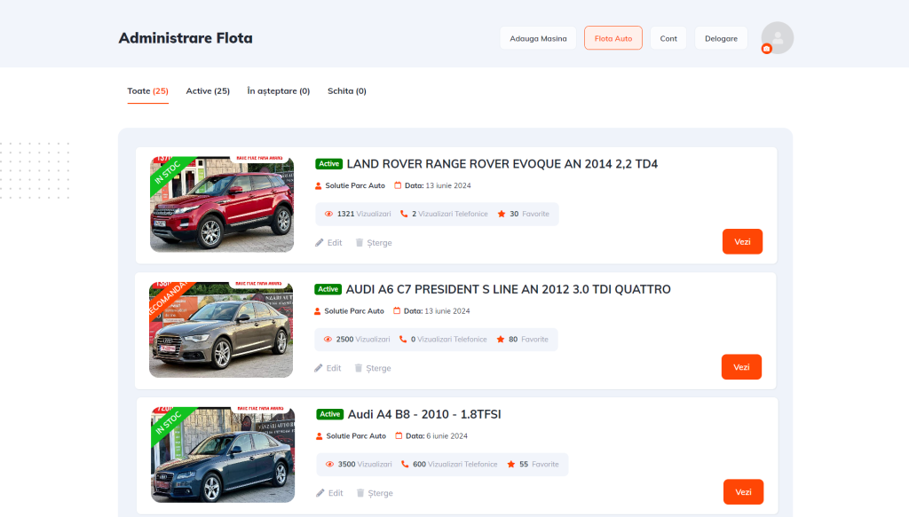 Ai totul intr-un singur loc: administrare simpla a stocului si o platforma testata, folosita deja de parcuri auto din Romania, cu o experienta de navigare care chiar ii convinge pe clienti sa te contacteze.